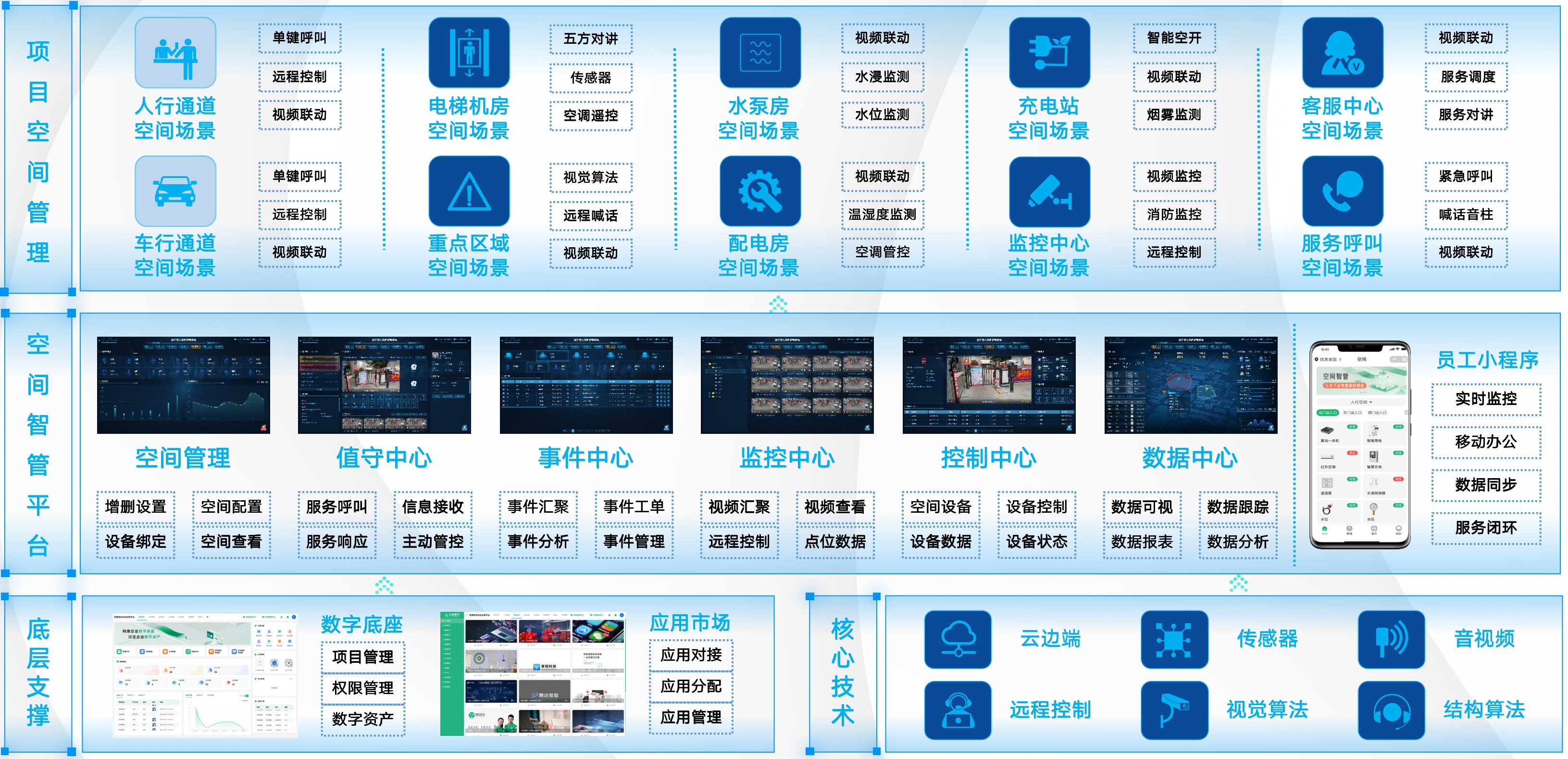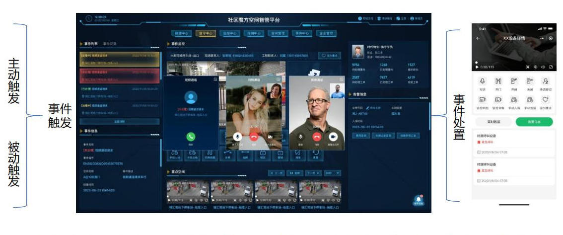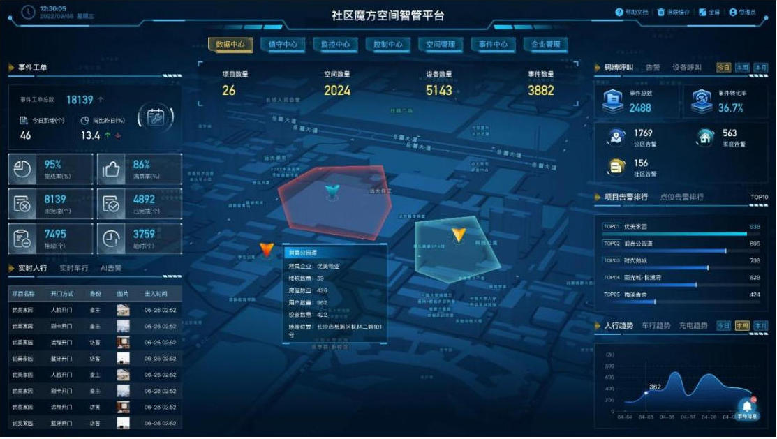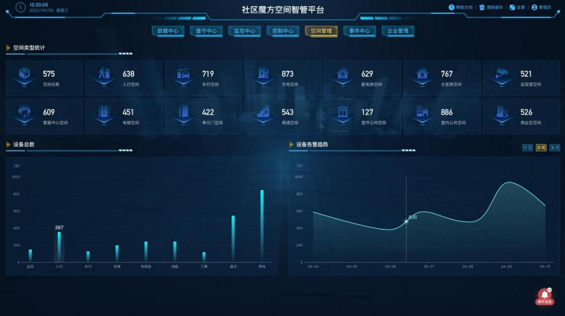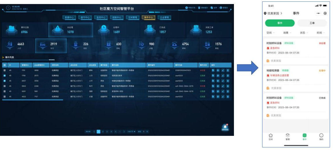 事件中心实时汇聚项目空间场景设备运行状态、告警信息、行为触发、服务呼叫等事件。