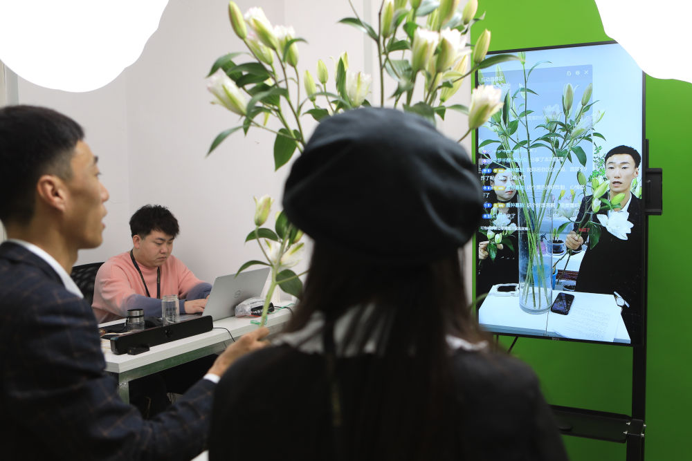 2023年1月5日,在辽宁省凌源市一家文化传媒公司,工作人员用直播方式推介凌源百合。新华社记者 王乙杰 摄